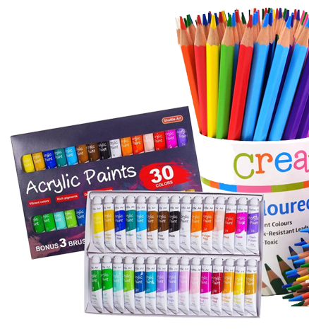 Colored pencils,Soft pastel sets,Oil,water acril paints all.
